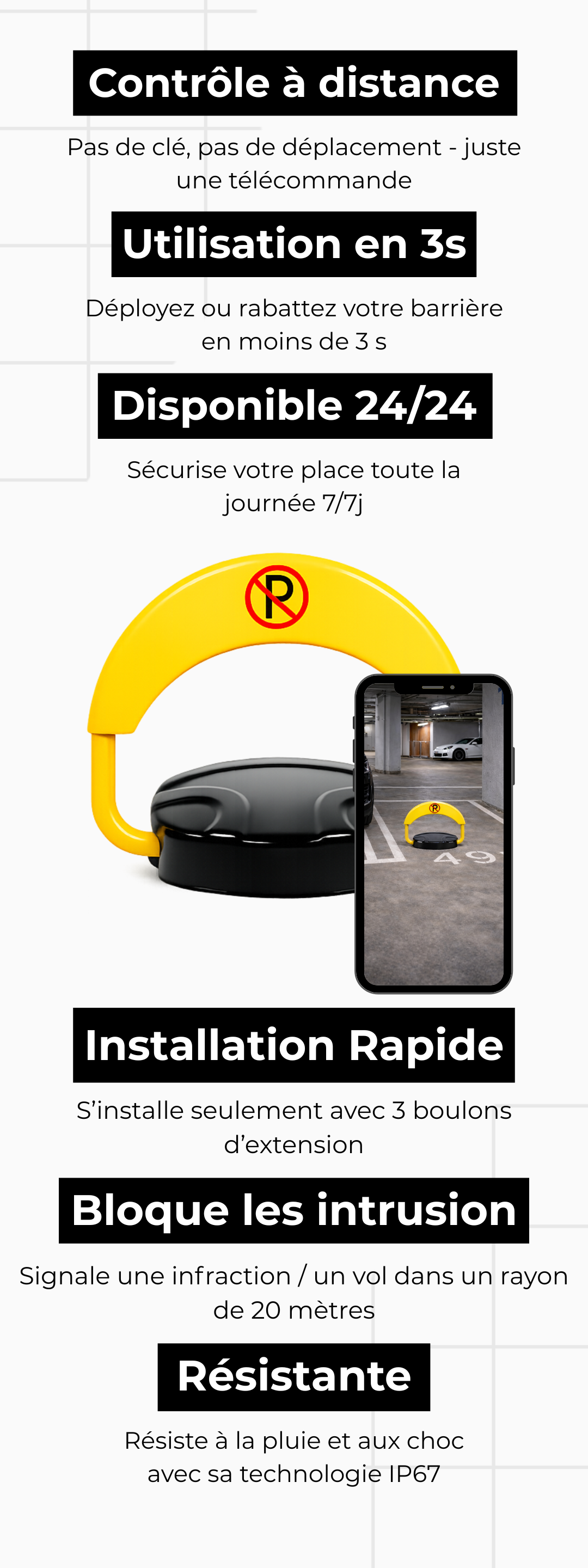 Cette barrière automatique empêche les intrusions et les dégradation avec son alarme de 60 décibels.